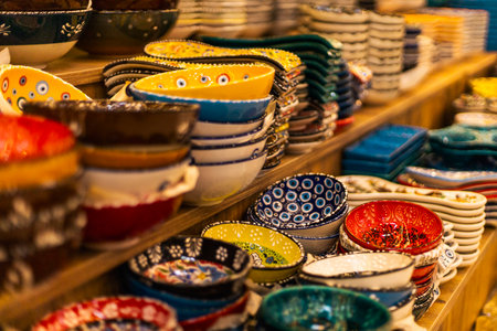 Colorful ceramic bowls for sale at a flea market in India