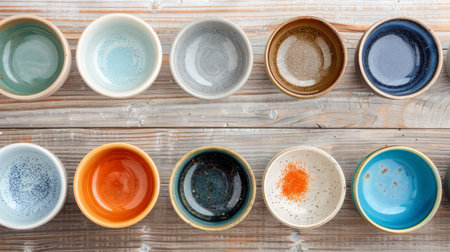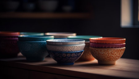 AI Generated. A table full of colorful ceramic bowls with various designs