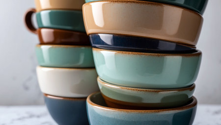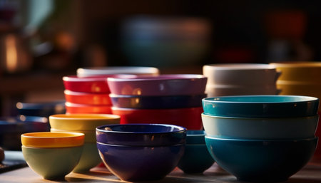 A vibrant stack of ceramic bowls in multiple colors adds a cheerful touch to any kitchen decor. Ideal for serving food or enhancing interior style.