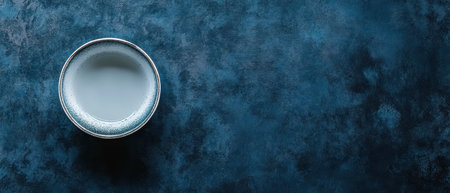 A simple bowl filled with milk rests on a deep blue textured surface creating a serene and calming visual arrangement.