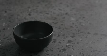empty black bowl on gray terrazzzo countertop, wide photo