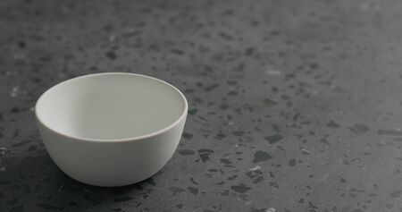 empty white bowl on gray terrazzzo countertop, wide photo
