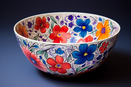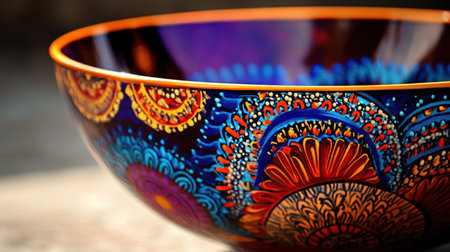 A stunning bowl with vibrant, hand-painted designs, showcasing a blend of intricate patterns and bold colors in a beautifully artistic creation