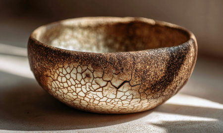 A bowl with a brown and white pattern. The bowl is cracked and has a rough texture. It is sitting on a table