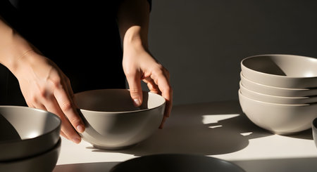 Hands place a beige ceramic bowl onto a white table, creating a composition with strong shadows and dramatic lighting. The minimalist aesthetic focuses on the simplicity of the object and the act of serving.