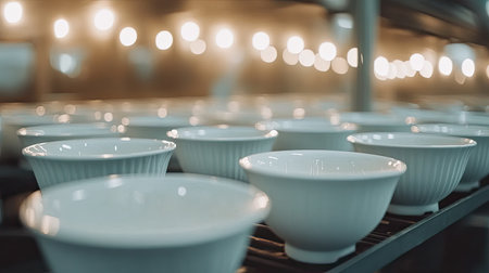 A collection of elegant white bowls arranged under warm, ambient lights in a modern restaurant kitchen, showcasing simplicity and culinary preparation.