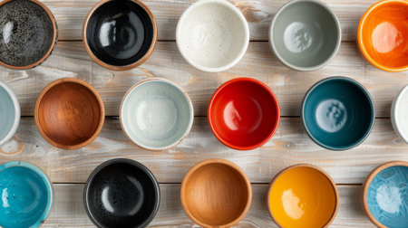 A stunning overhead view of colorful ceramic bowls arranged on a textured surface, showcasing vibrant colors that enhance any kitchen or dining space.