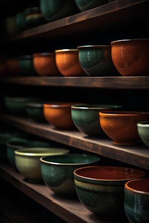 Multi colored ceramics collection on wooden shelf generated by artificial intelligence