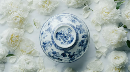 A beautiful porcelain bowl featuring floral designs is centered among soft white blossoms, creating an elegant and serene composition. Perfect for decor and aesthetic visuals.