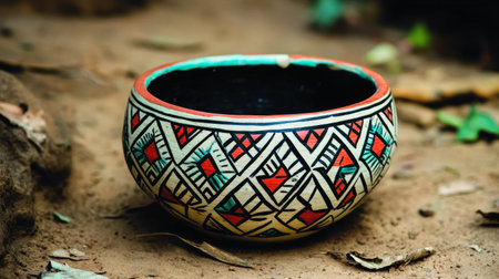 This image features a colorful handcrafted pot adorned with intricate patterns resting on a textured ground, showcasing the beauty of traditional craftsmanship and artistic design.