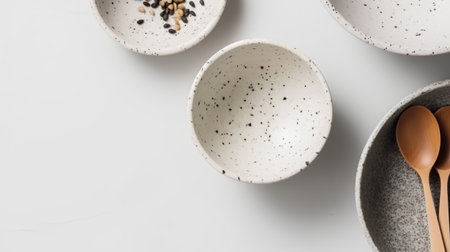 Empty bowls and spoons on a white background with space for text