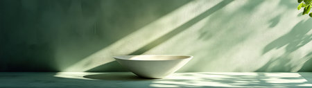This image features a minimalistic ceramic bowl placed on a soft green surface, accentuated by gentle shadows, creating a tranquil and modern aesthetic.