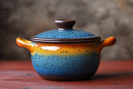 A beautiful ceramic cooking pot sits elegantly on a smooth neutral background, highlighting its vibrant colors and design. Ideal for culinary use and food presentation.
