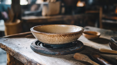 A rustic clay bowl rests on a wooden table in a cozy kitchen setting, surrounded by vintage utensils. This warm scene evokes a sense of traditional cooking and craftsmanship.
