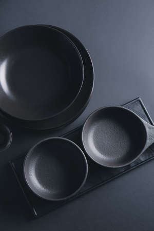 Ceramic tableware on a dark background. Top view.