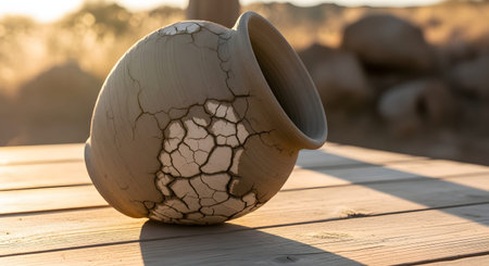 A rustic clay pot with a textured, cracked surface sits on a wooden table, bathed in warm, soft sunlight. The image evokes themes of pottery, craftsmanship, wabi-sabi aesthetics, or the fragility of art.