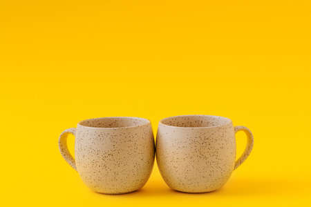 Classic closeup of white empty tea cups. Design Style with space. Background concept. Art Mockup view. Wood texture. Modern collection for lifestyle. Coffee break for drink. Simple life