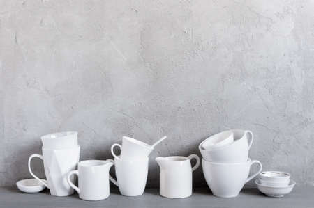 White coffee cups in coffee shop. Interior of cafe with tea mugs and milk jugs. Toned with filters with pastel colors. Retro vintage style.