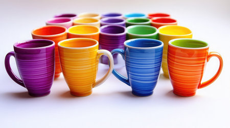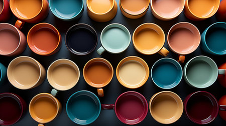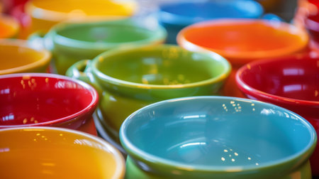 An artistic arrangement of colorful ceramic cups and bowls creates a warm and inviting atmosphere, showcasing vibrant designs and textures, perfect for home d