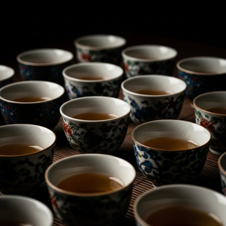 An inviting display of traditional tea cups set on a rustic wooden table, surrounded by tranquil nature and soft lighting, perfect for showcasing a serene beverage culture.