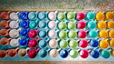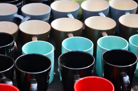 Colorful Vivid Ceramic Coffee Mugs On Sale on the Tiled Floor