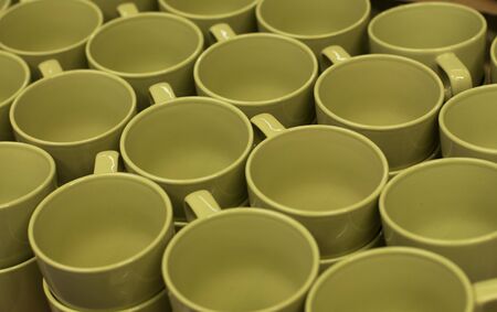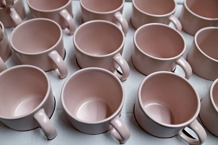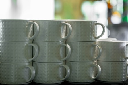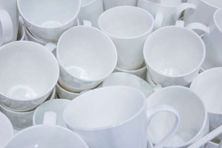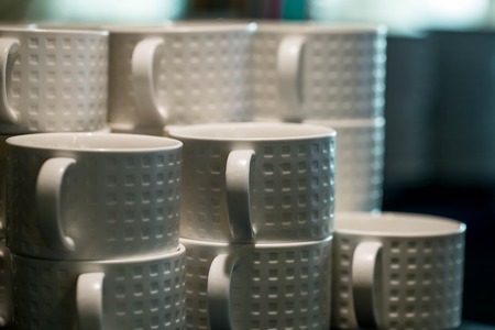 A lot of white porcelain tea pairs in piles in a straight line. Concept conference at the hotel, break, catering, breakfast