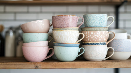 A stack of mismatched vintage cups in various pastel colors and patterns, placed on a wooden shelf in a cozy kitchen