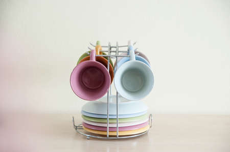 Pile of colorful cups of coffee on wooden table with cream background. Middle of frame, wallpaper.