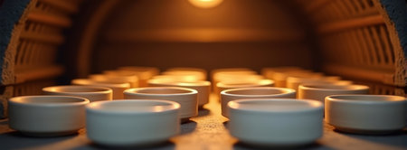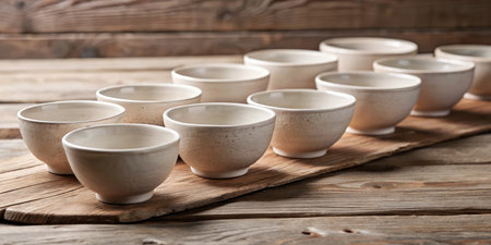 This image captures a serene and symmetrical arrangement of Chinese ceramic tea bowls on a light wooden surface. The bowls feature a minimalist design with delicate speckles, and one is in sharp focus while the others gradually blur into the background, creating a sense of depth and tranquility. Perfect for themes of minimalism, tea culture, ceramics, and the beauty of simplicity.