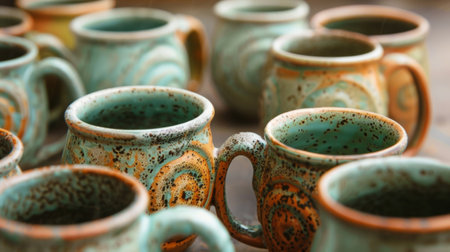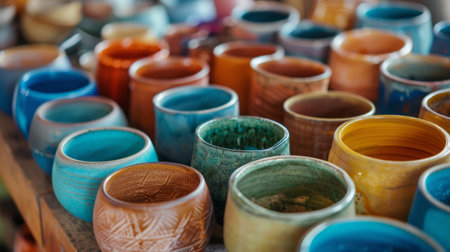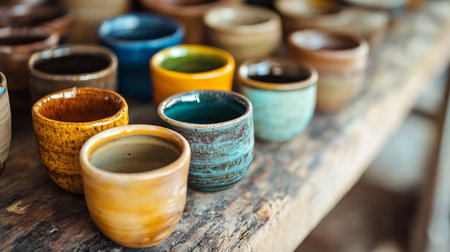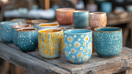 A beautiful assortment of handcrafted ceramic cups and mugs displayed on a rustic table. The colorful designs and intricate textures add charm to any setting.
