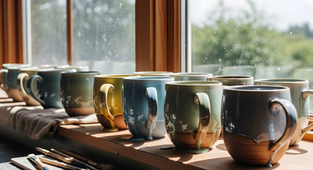 A row of handmade ceramic mugs in various shades of blue and green sits on a wooden window sill to dry. Sunlight streams through the window, highlighting the glazed textures and drips on the pottery. This peaceful still life showcases the beauty of artisanal craft and pottery studio vibes.