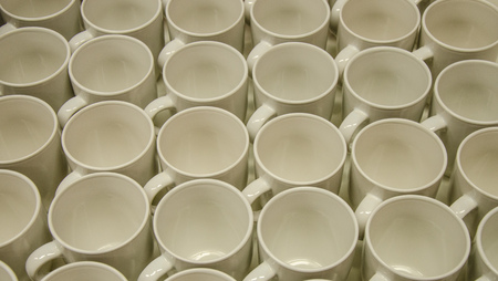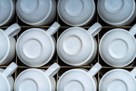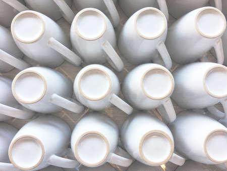many of the same white mugs for drinks, coffee or tea. stand upside down in a drawer