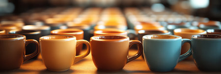 Colorful coffee cups arranged neatly on a wooden table in a cozy cafe during the morning, creating an inviting atmosphere for coffee lovers and visitors
