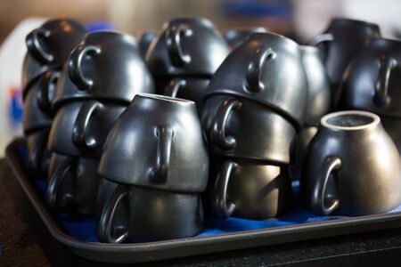 Many white tea and coffee cups on black background. Preparation for the banquet