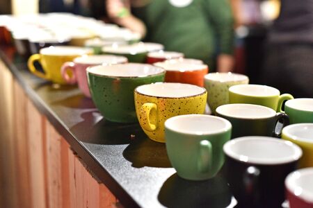 Colorful ceramic cup on the wooden table in coffee shop, stock photo