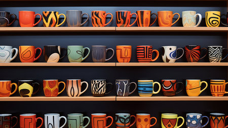 rows of plain mugs lined up on wooden shelves, created with generative ai