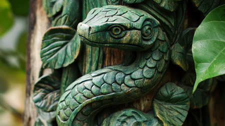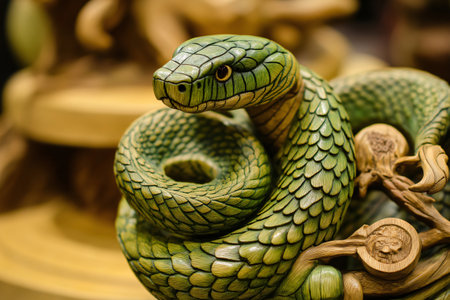 Carved wooden sculpture of a green snake is coiled around a branch with its scales meticulously carved