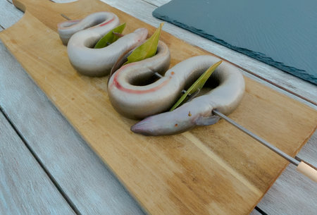 Fresh raw eel skewered with bay leaves on wooden board ready for cooking