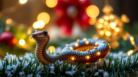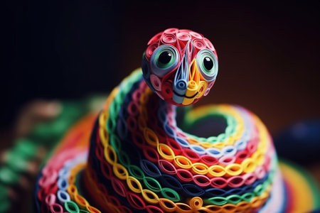 Toy snake on table with red flowers, bright colors and playful arrangement, indoor setting, casual decor.