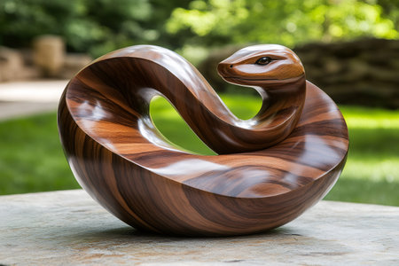 Wooden snake sculpture representing infinity symbol resting on a stone table in a garden