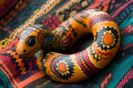 Wooden snake with traditional Mexican decoration resting on a colorful textile with geometric patterns