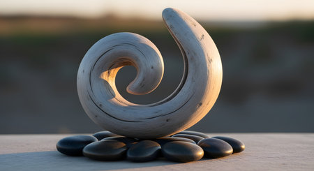 A serene and minimalist still life composition featuring a spiral-shaped piece of weathered driftwood resting on smooth, dark pebbles. The warm light of sunrise or sunset softly illuminates the scene, creating a tranquil and balanced image that symbolizes zen, harmony, and nature.