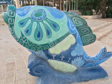 Illustrative editorial painted graffiti of sculpture fish in the square of the city of Eilat. Israel,Eilat,June 2018