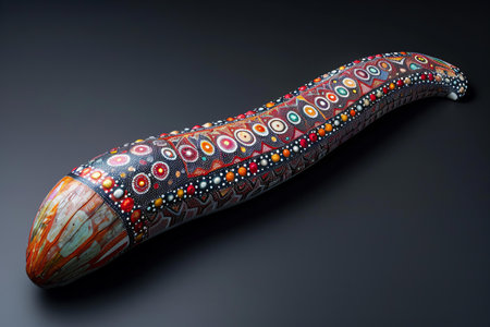 Featuring a traditional australian boomerang with dot art designs, displayed on a black background. the colorful and intricately painted design features aboriginal patterns inspired