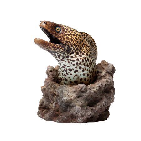 Isolates showing moray eel head emerging from coral with mouth open keywords: moray eel, marine life, ocean, sea, underwater, animal, creature, predator, jaws, teeth, open mouth, yellow eye, spotted, patterned, brown, white, coral, rock, texture, aquatic, wildlife, exotic, dangerous, venomous, predatory, hunting, isolated, black background, studio, cutout description: the head of a spotted moray eel emerges from a textured, porous coral formation. the eel has a distinctive brown and white...