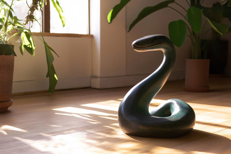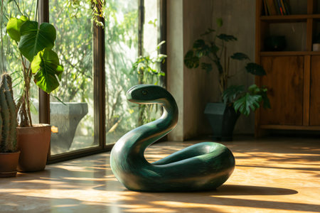 Green wooden snake sculpture is displayed on a hardwood floor, bathed in warm sunlight streaming through a nearby window