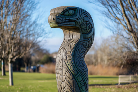 Green wooden totem pole with intricate carvings is standing tall in a park, representing the rich history and traditions of native American culture