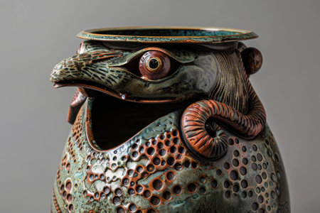 A beautifully crafted ceramic vase featuring a frog design, showcasing detailed textures and vivid colors, set against a simple gray background for emphasis.