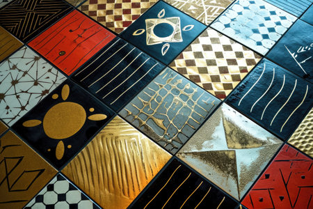 The picture of the colorful multiple tiles that has been use on the ground inside of the building that has been taken in the daytime of the bright day of the sun in the morning of the years. AIGX01.