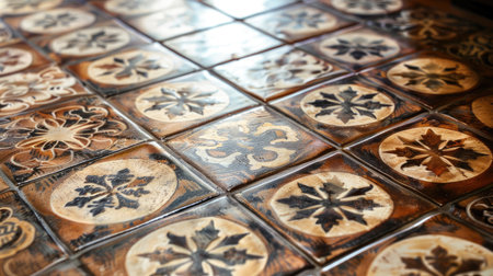 A close-up of beautifully patterned brown and beige ceramic tiles, creating a stunning floor design